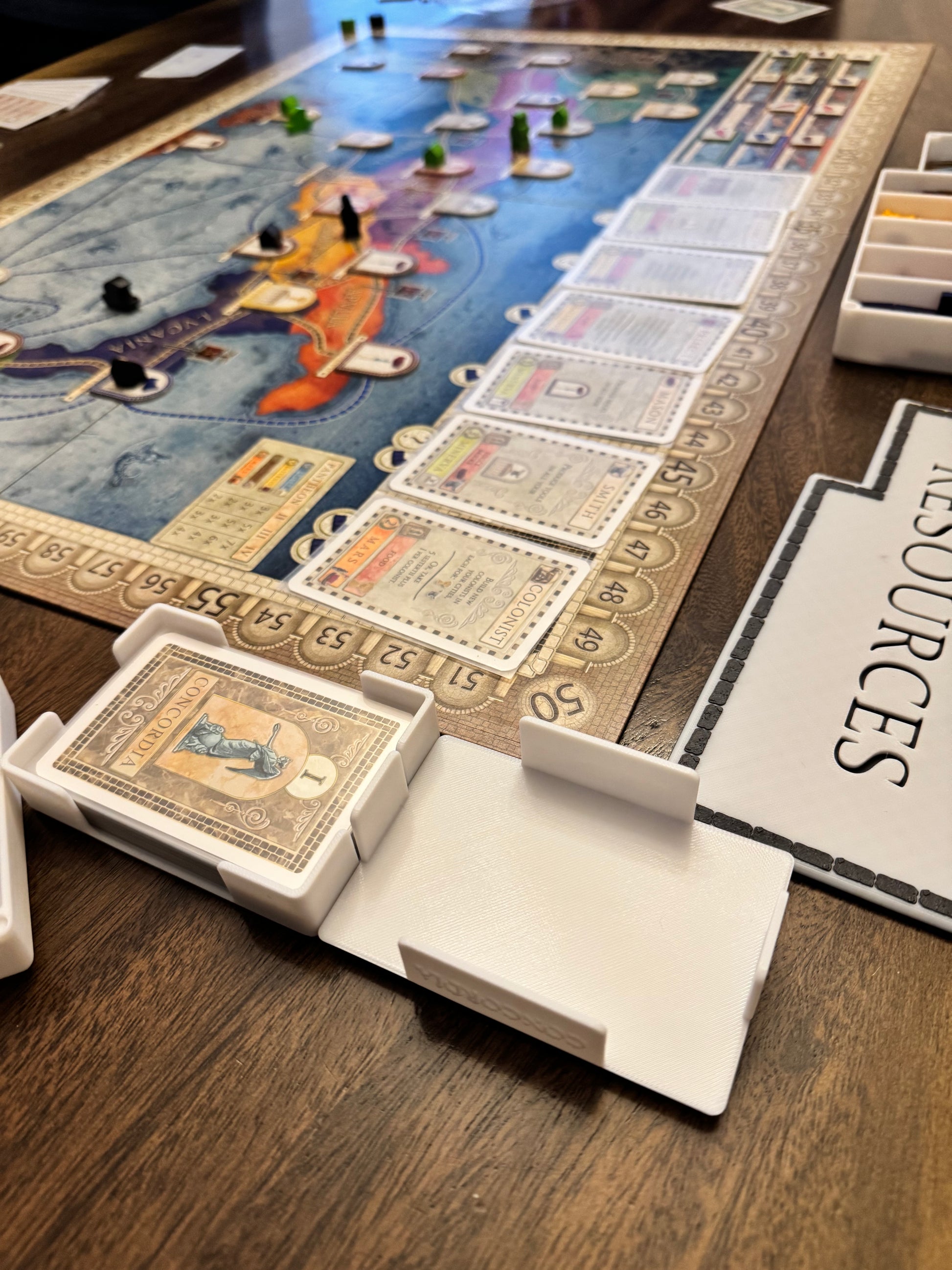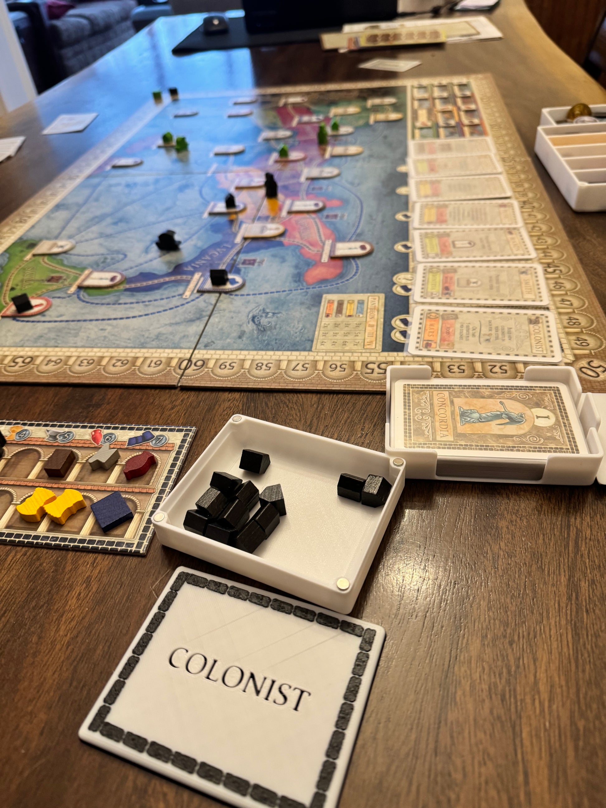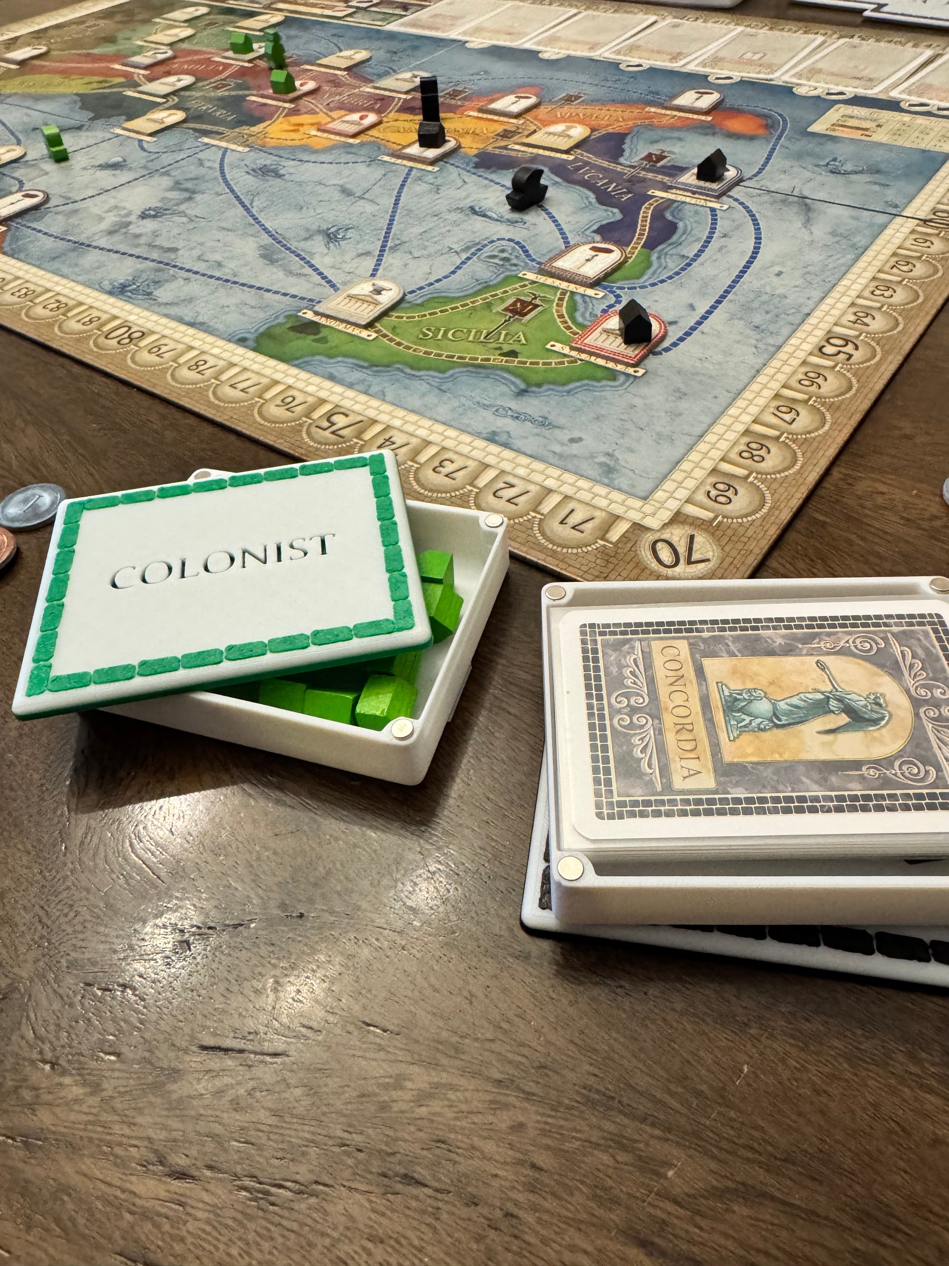 Organizational insert for base game Concordia. Included are game inspired 3d printed designed boxes for 5 players, a box for resources, set up pieces and coins. All boxes have magnetic lids. Also included with this set will be boxes and lids for Soltaria (solo play) and for the added pieces for the expansion Concordia Salsa.